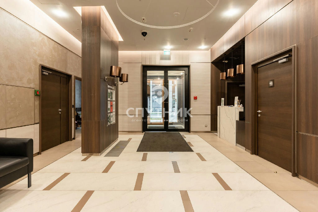 На первом этаже корпуса находится изысканное лобби, встречающее сдержанной, но безошибочно дорогой эстетикой с круглосуточным консьерж-сервисом и деталями заботы в виде мест для отдыха и хранения.